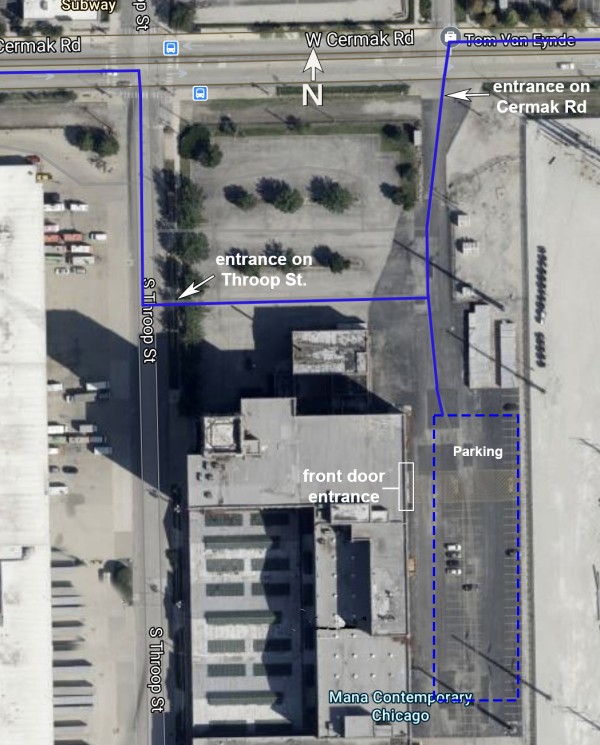 The entrance and parking lot are located on the East side of the building. The lot is accessible via entrances on Cermak Road and Throop street.